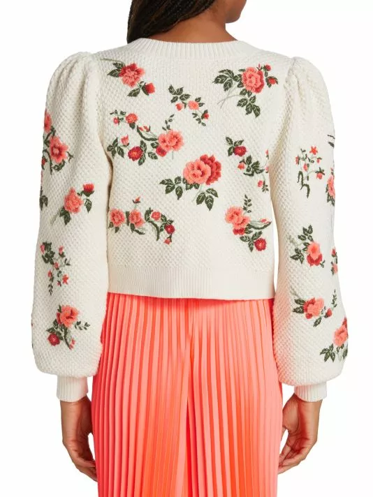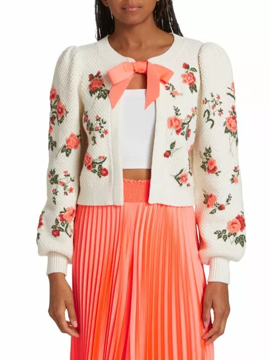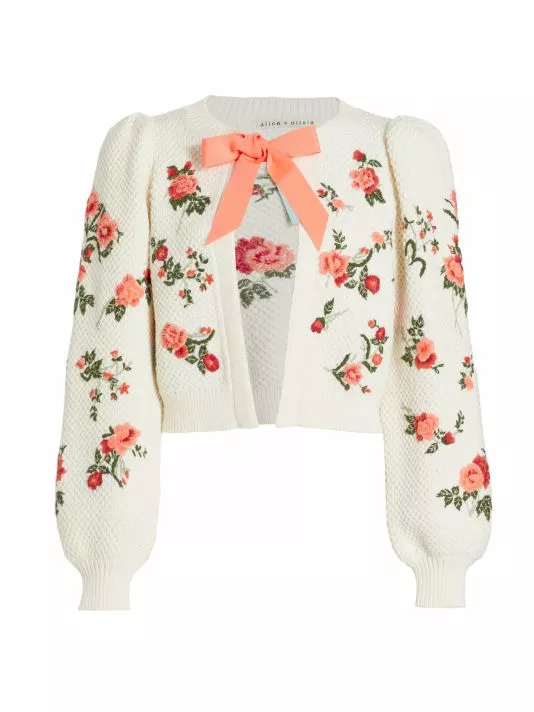 Alice + Olivia’s Kitty cardigan is designed with floral embroidery and a bow tie-closure.
