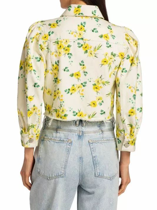 Crafted of denim with a floral print, the Lana jacket is designed with long puff-sleeves and a raw hem.