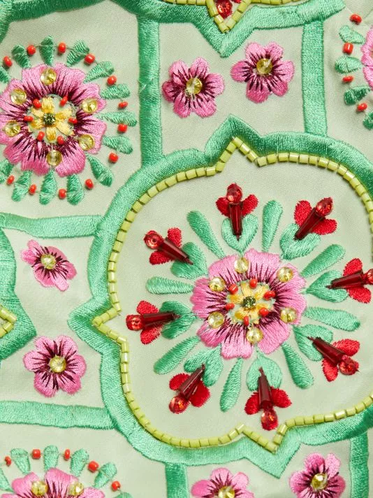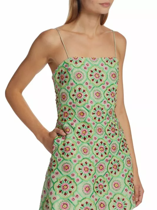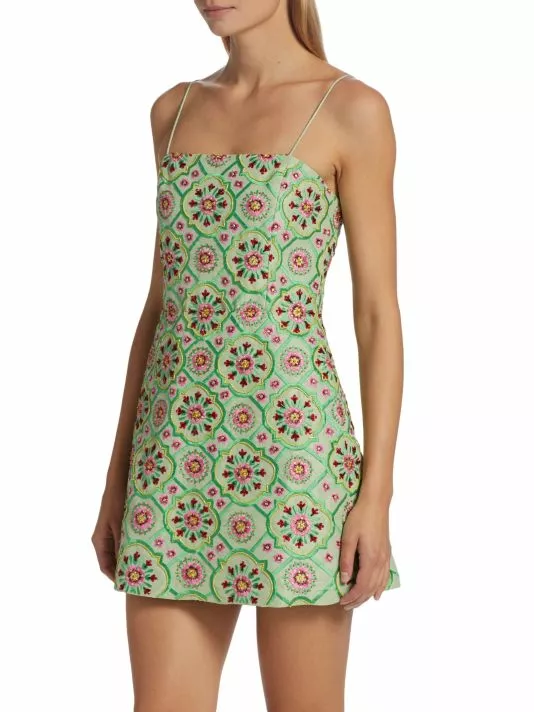 Alice + Olivia’s Lawrence minidress is adorned with multicolored embroidery in an A-line silhouette.