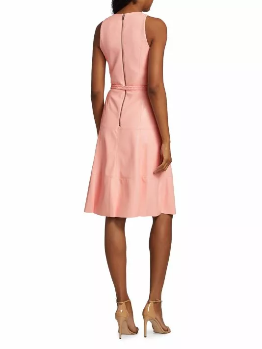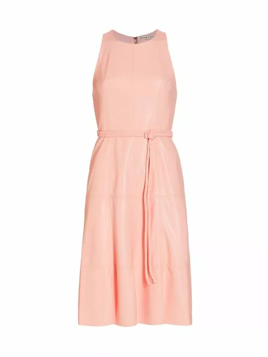 Crafted of vegan leather, Alice + Olivia’s Leandra midi dress is cinched with a long braided leather belt.