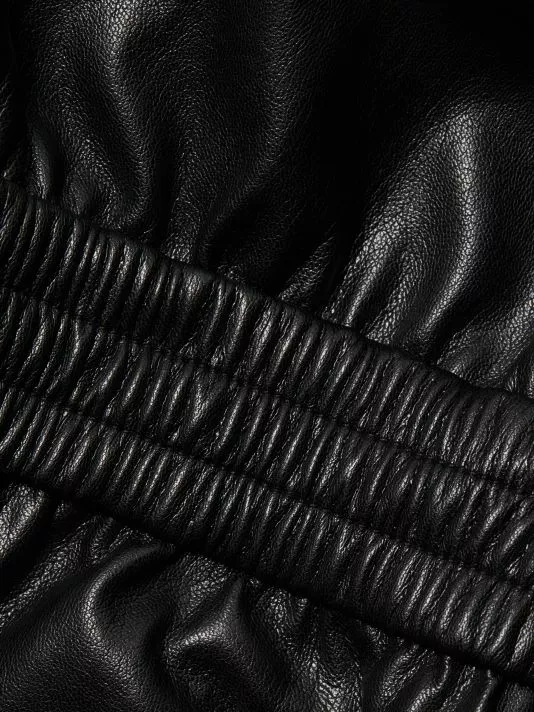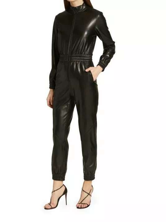Constructed of lustrous vegan leather, this ankle-crop jumpsuit is enhanced by smocked, elasticized detailing.