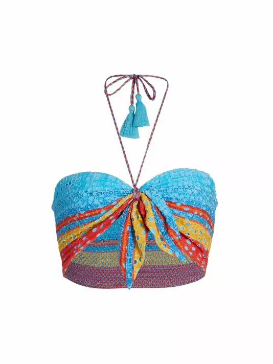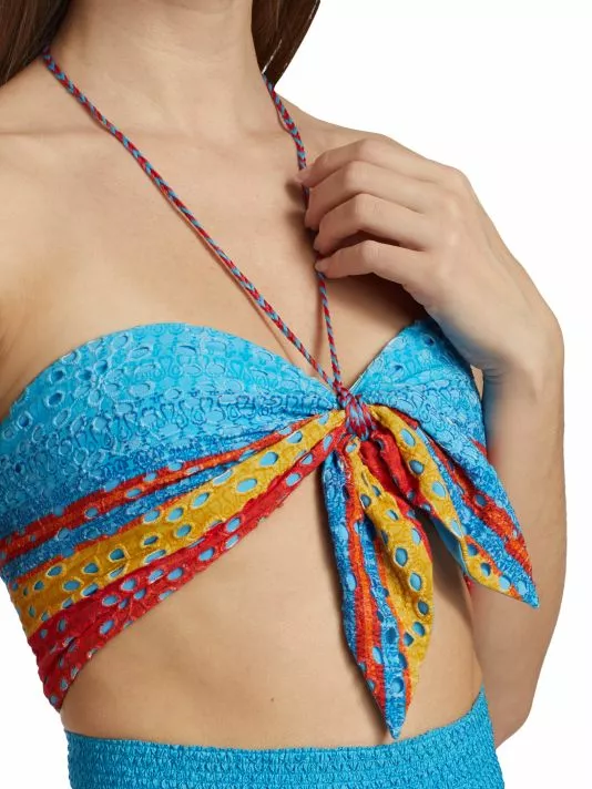 Finished with tassel ties, the Livia halter top by Alice + Olivia is crafted of colorful layers of cotton with detailed eyelet embroidery.