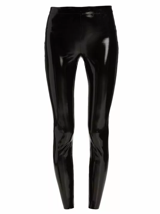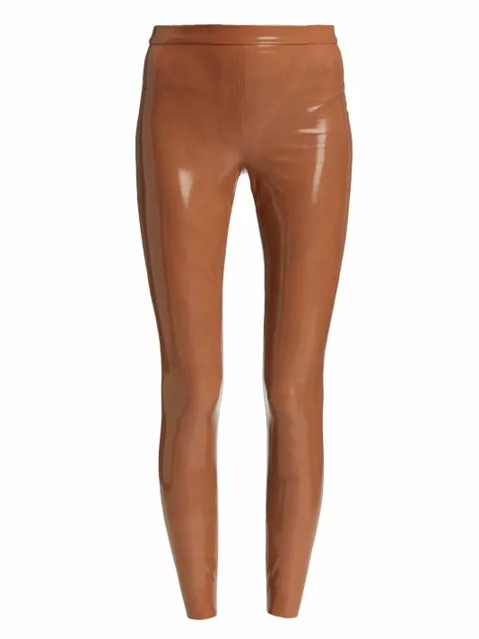 Ultra high-waisted leggings crafted of shiny vegan latex, features an edgy exposed zip closure at back.