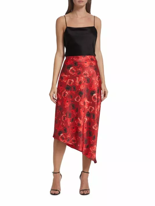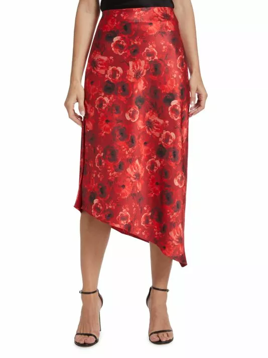 ONLY AT SAKS. Cut with an edgy asymmetric hem, Alice + Olivia’s Maeve midi-skirt boasts a slinky slip silhouette. This style is adorned with bright florals and features a side slit for added movement.