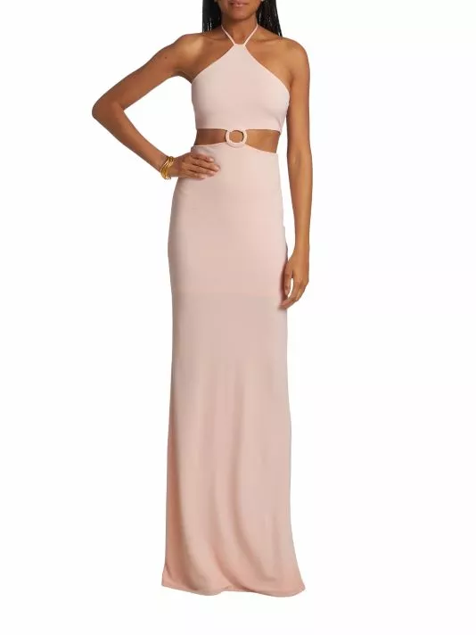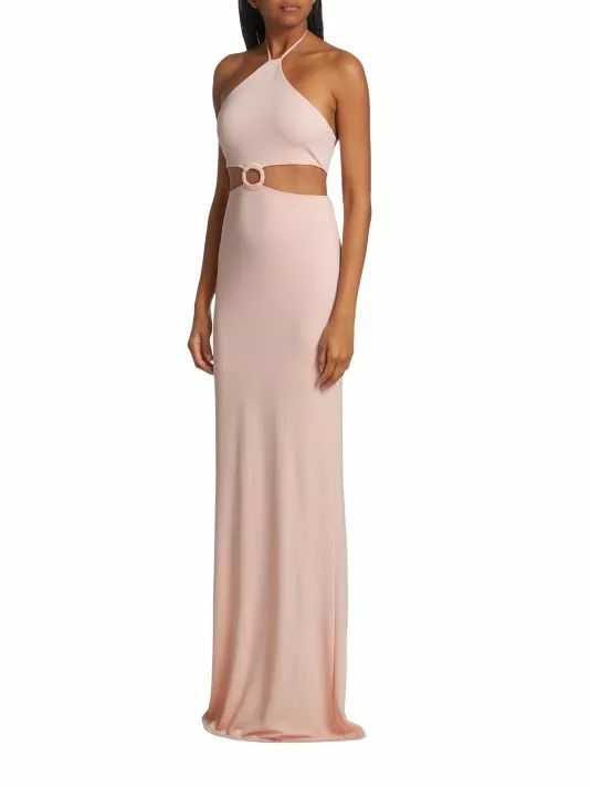 Alice + Olivia’s Marguerite maxi dress features a halterneck and wraparound side cut outs. A center O-ring detail and an exposed back zip closure finish this sleek style.