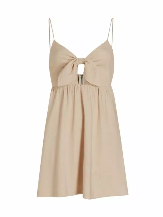 Crafted of a linen blend, the Melvina minidress from Alice + Olivia is styled with ultra-thin spaghetti straps, tie-front detail, and a center cutout.