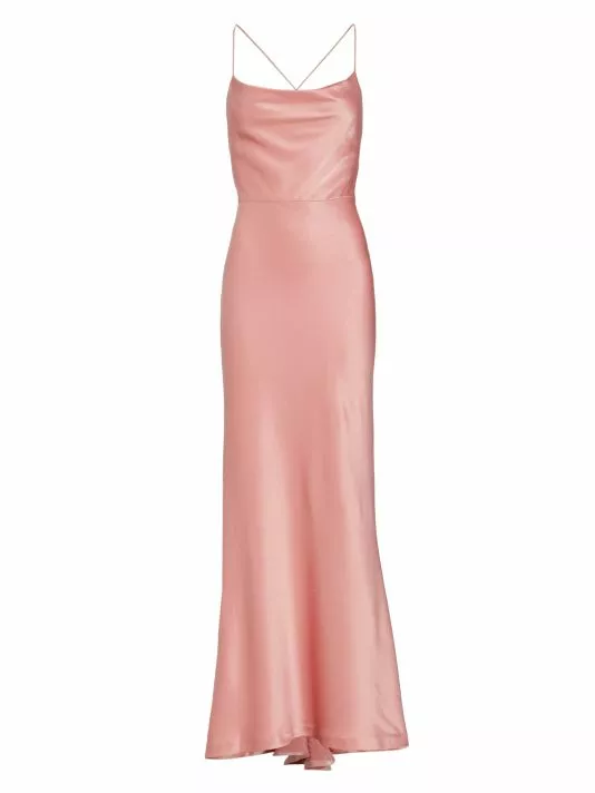 The Montana gown from Alice + Olivia is cut in a sleek silhouette. Crafted of shiny satin, this alluring piece is complete with a cowlneck and an open-back strappy tie detail.