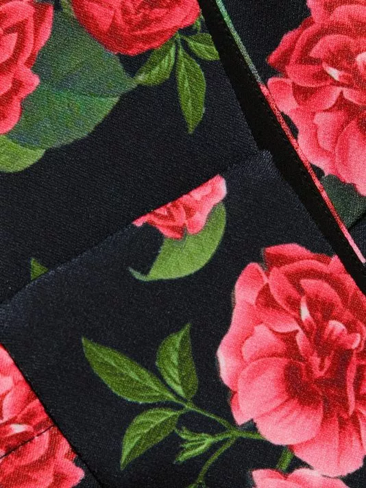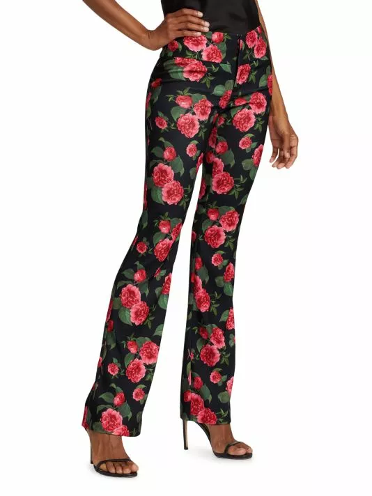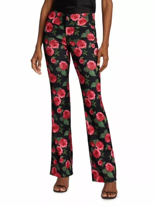 The Olivia trousers from Alice + Olivia feature a slim fit through the hip and thigh that tapers into a slight flare leg. A wide waistband and a romantic rose print complete this polished style.