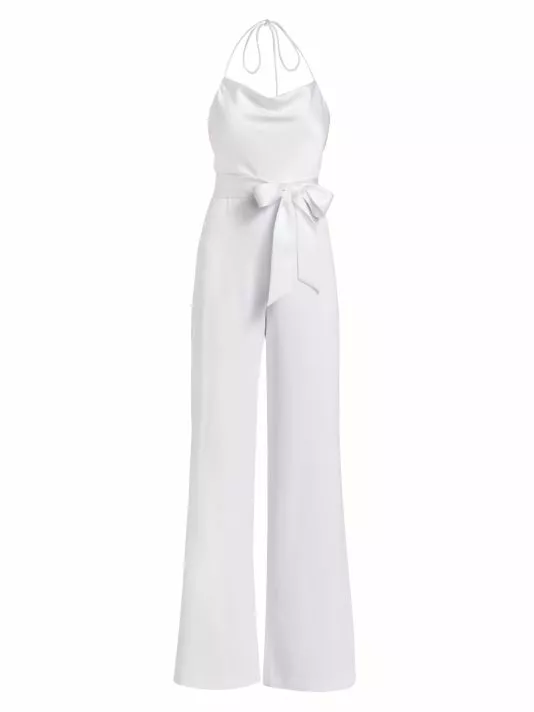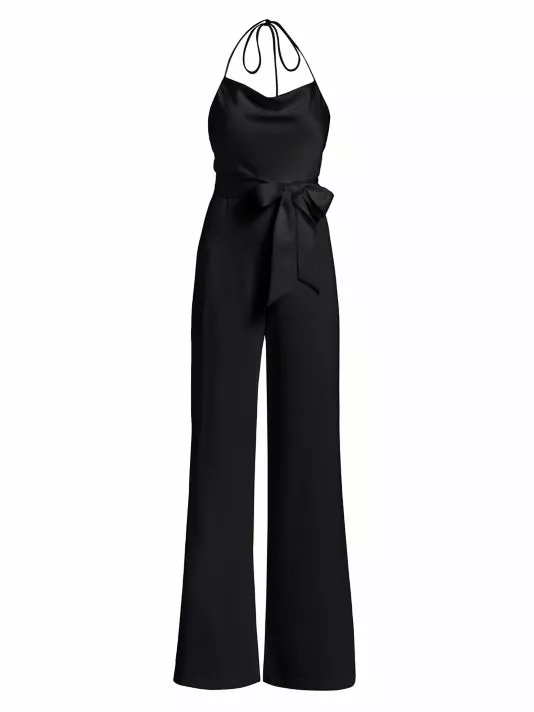 The Primrose jumpsuit by Alice + Olivia is crafted of smooth satin with a halter neck and flared pant legs.