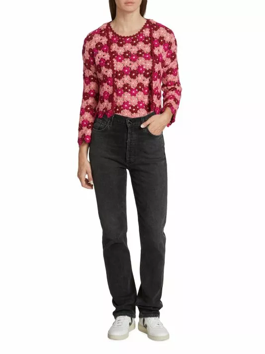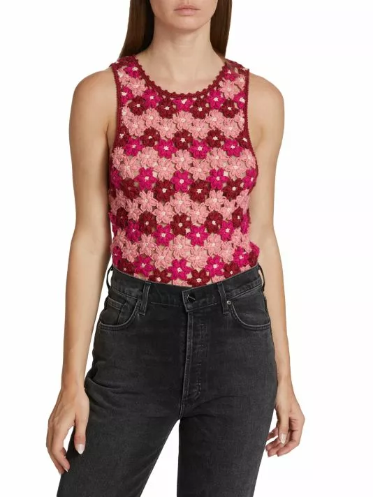 Crafted of crocheted cotton, Alice + Olivia’s Reva shell top is detailed with a round neck, keyhole back, and floral pattern.