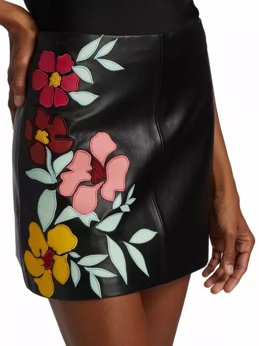 The Riley vegan leather miniskirt from Alice + Olivia features an embroidered floral motif. Beaded details finish this elevated classic style.
