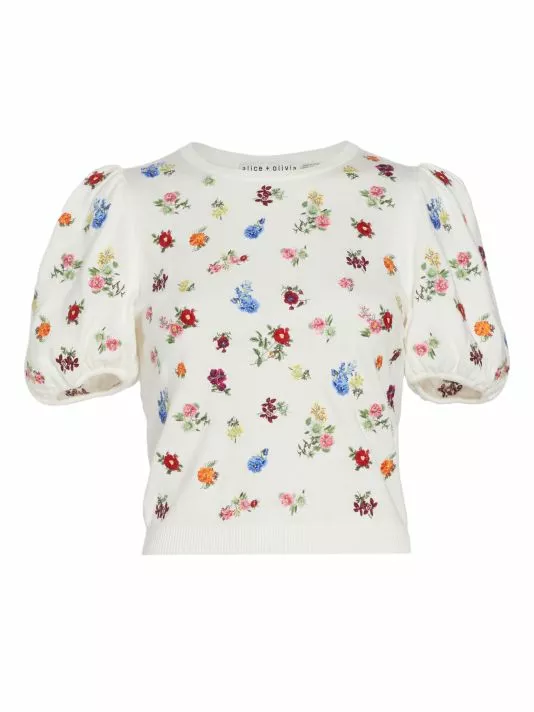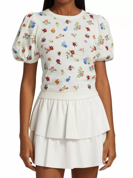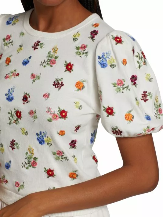 This whimsical top is embroidered with a charming floral motif, framed by puff sleeves.