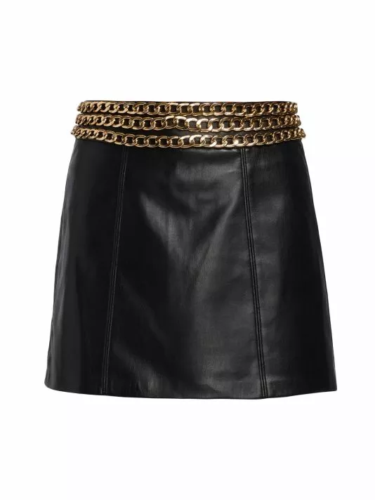 This chic miniskirt from Alice + Olivia boasts an edgy faux-leather design. Adorned with goldtone chains at the waist, this style evokes a moto aesthetic.