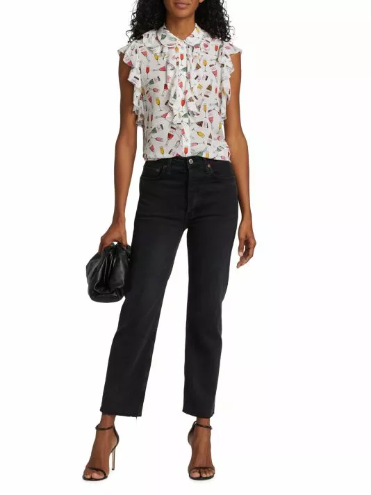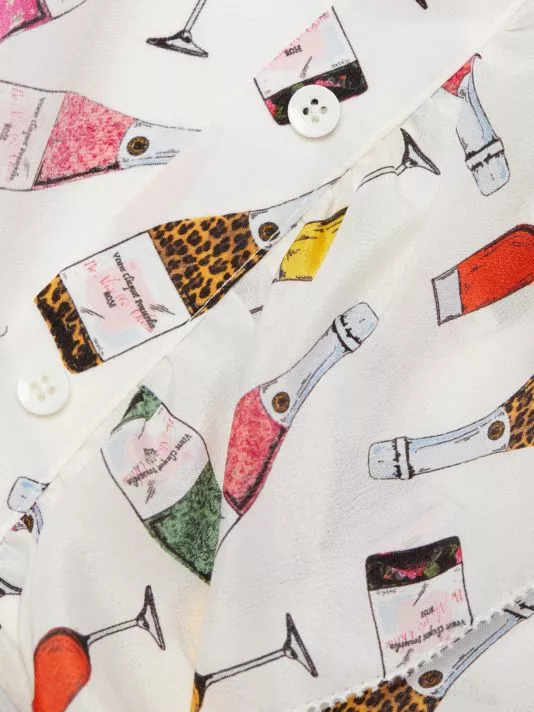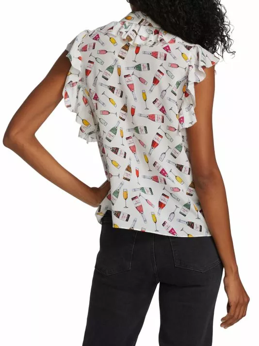 The Robbie button-front blouse from Alice + Olivia is crafted of pure silk in a playful wine bottle print. Ruffled shoulder details and a peter pan collar complete the look.