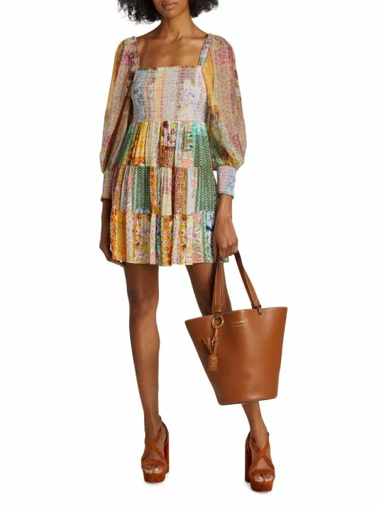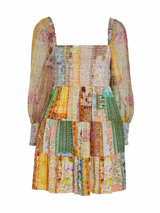 Alice + Olivia’s Rowan tunic dress features an empire-waist silhouette with a square neck and a tiered skirt. Long, semi-sheer blouson sleeves finish this bohemian style.