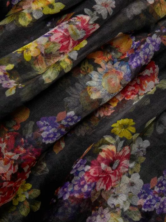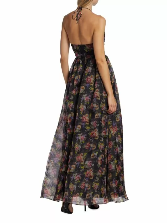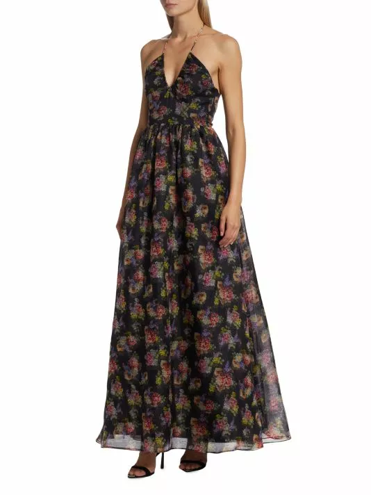 Crafted of silk, Alice + Olivia’s Saori princess gown is adorned with a playful floral print. This full-skirted style is complete with a plunging V-neck and a halter-tie.
