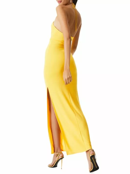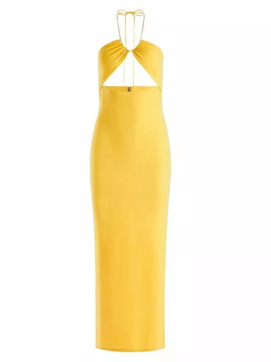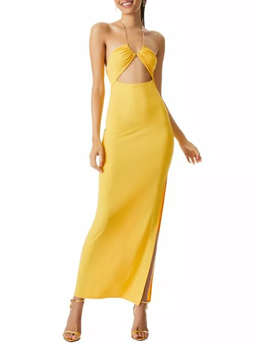 Alice + Olivia’s Sariya maxi-dress is cut from a slinky interlock knit fabric. Featuring an alluring cut-out front, this sleeveless style showcases a chain halterneck, open back, and an elongating side slit.