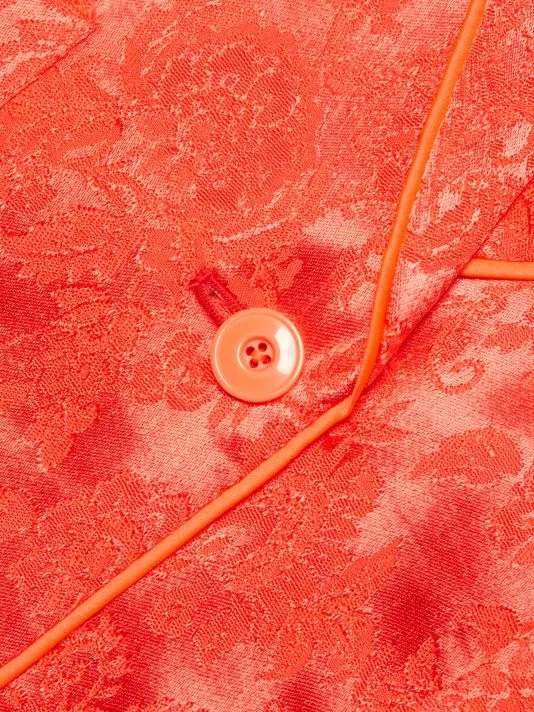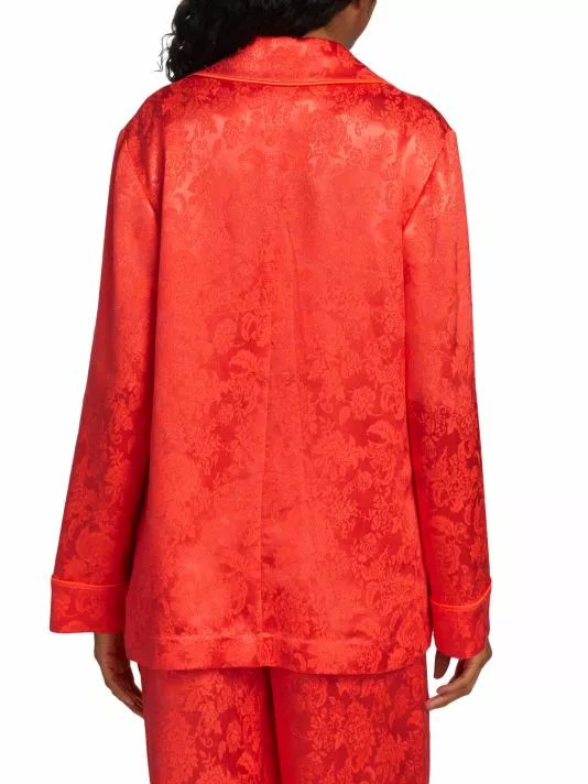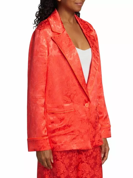 Alice + Olivia’s Shanda pajama blazer is crafted of bright jacquard satin. Wide peak lapels and contrast piping define this relaxed-fit style.