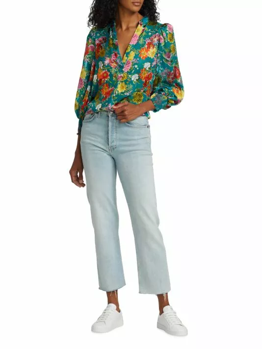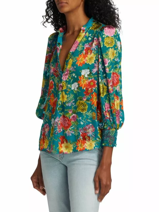 Crafted of bright floral satin, Alice + Olivia’s Sheila top features a split neck and blouson sleeves with smocked cuffs.