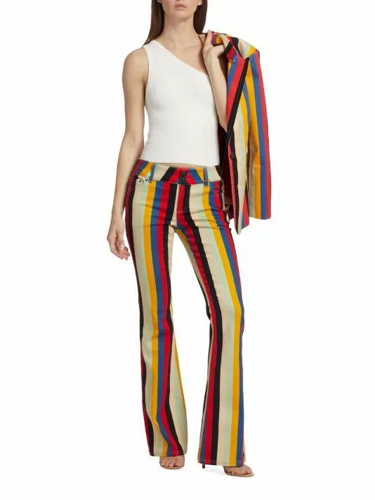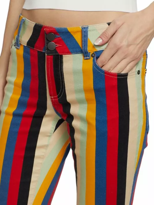 Slung with a chic mid-rise fit, these bell bottom pants elongate the leg with a striking vertical stripe.