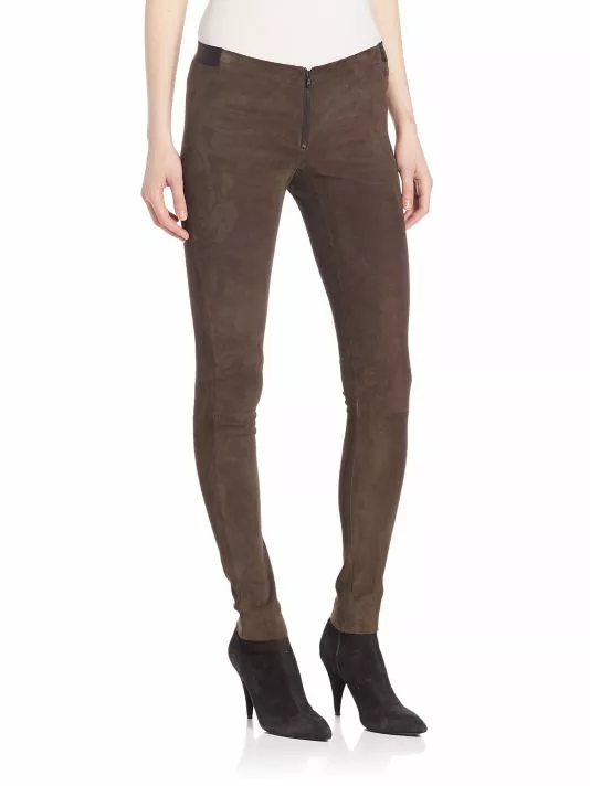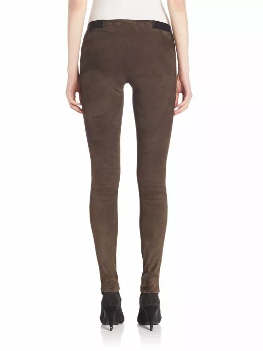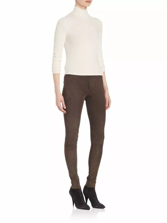 Plush suede articulated in a divine rocker-chic silhouette is extra-long and worn scrunched at the unhemmed ankle.