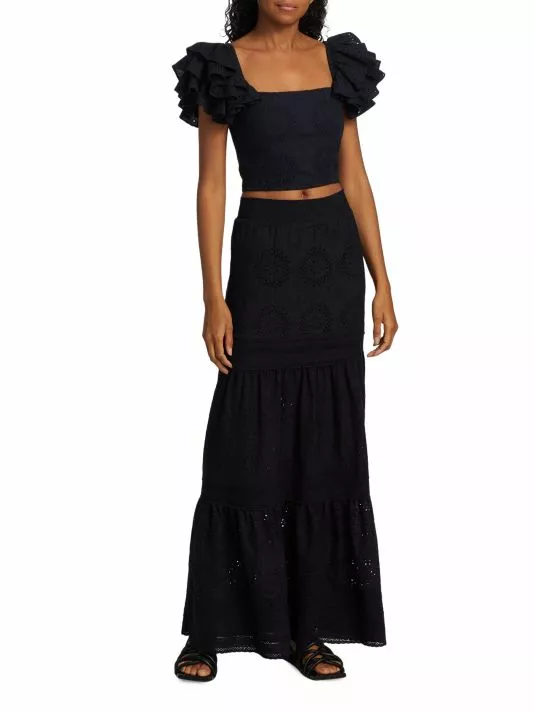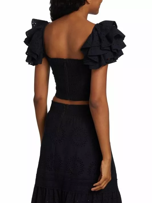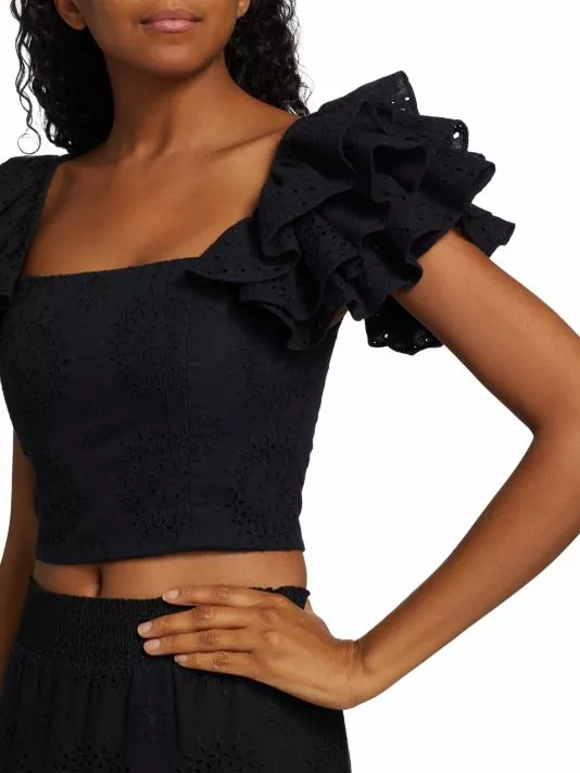 Crafted of cotton-linen blend eyelet lace, the Tawny top from Alice + Olivia features a fitted square neck bodice and a smocked back. Layered ruffled sleeves finish this cropped look.