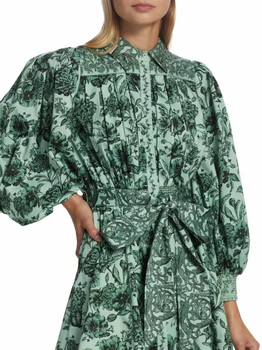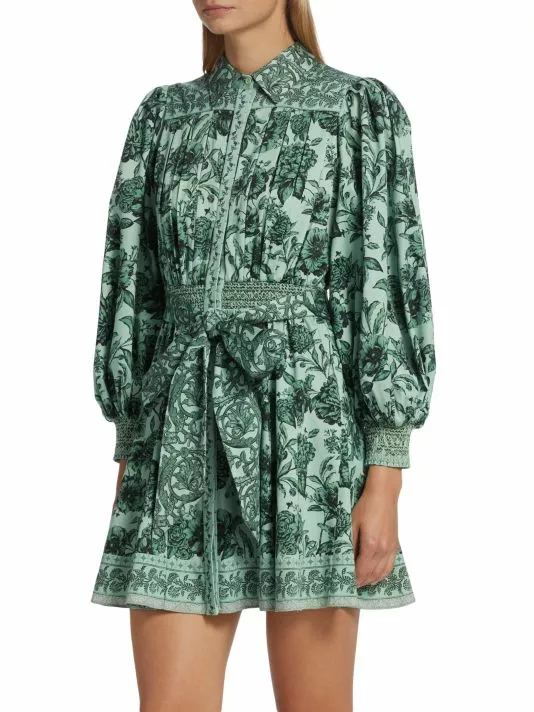 Alice + Olivia’s Tiffie minidress is adorned with an ornate floral print. Designed with a self-tie belt, this button-front style features blouson sleeves and smocked cuffs.
