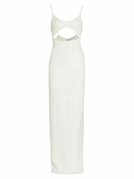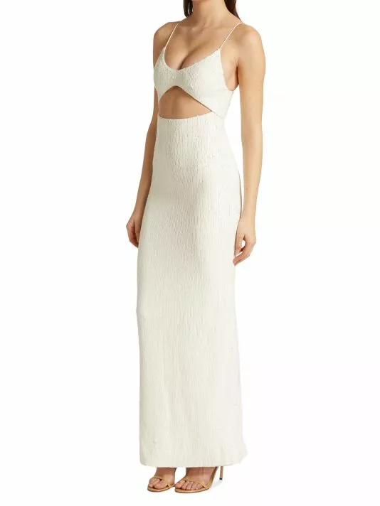 This chic maxi-dress captures a sophisticated edge, featuring a large bodice cut-out and sequined finish.