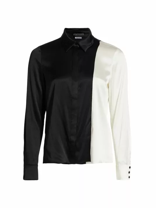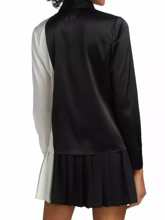 Silk-blend shirt features a striking split design features a point collar and concealed button placket.
