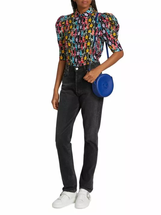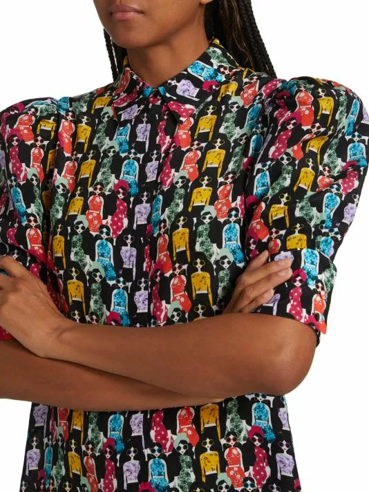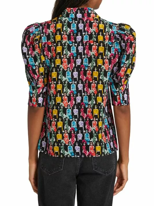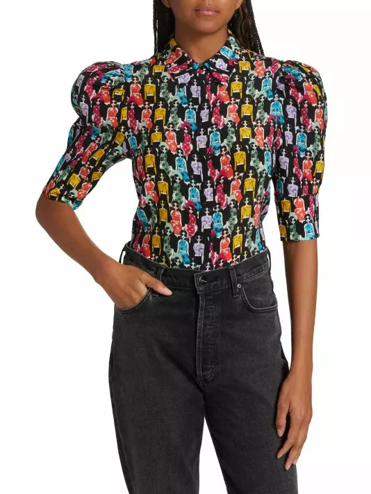 The Willa shirt from Alice + Olivia is adorned with a multicolor print with bold puff sleeves.