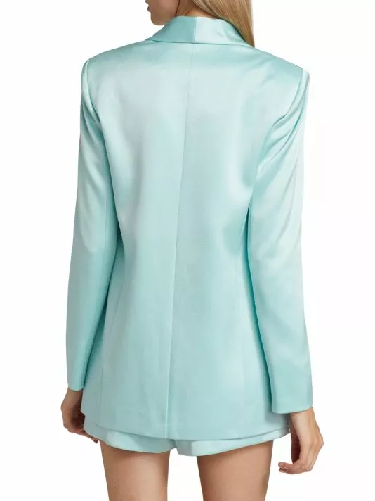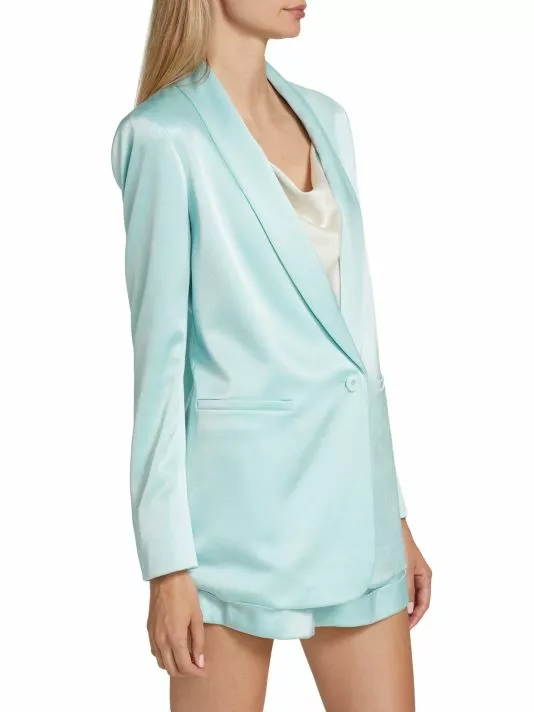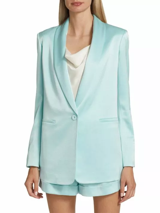 Alice + Olivia’s Yuriko blazer is crafted of lustrous satin. Cut for a boxy fit, this tailored style features shawl lapels, structured shoulders, and dual welt pockets at the front.